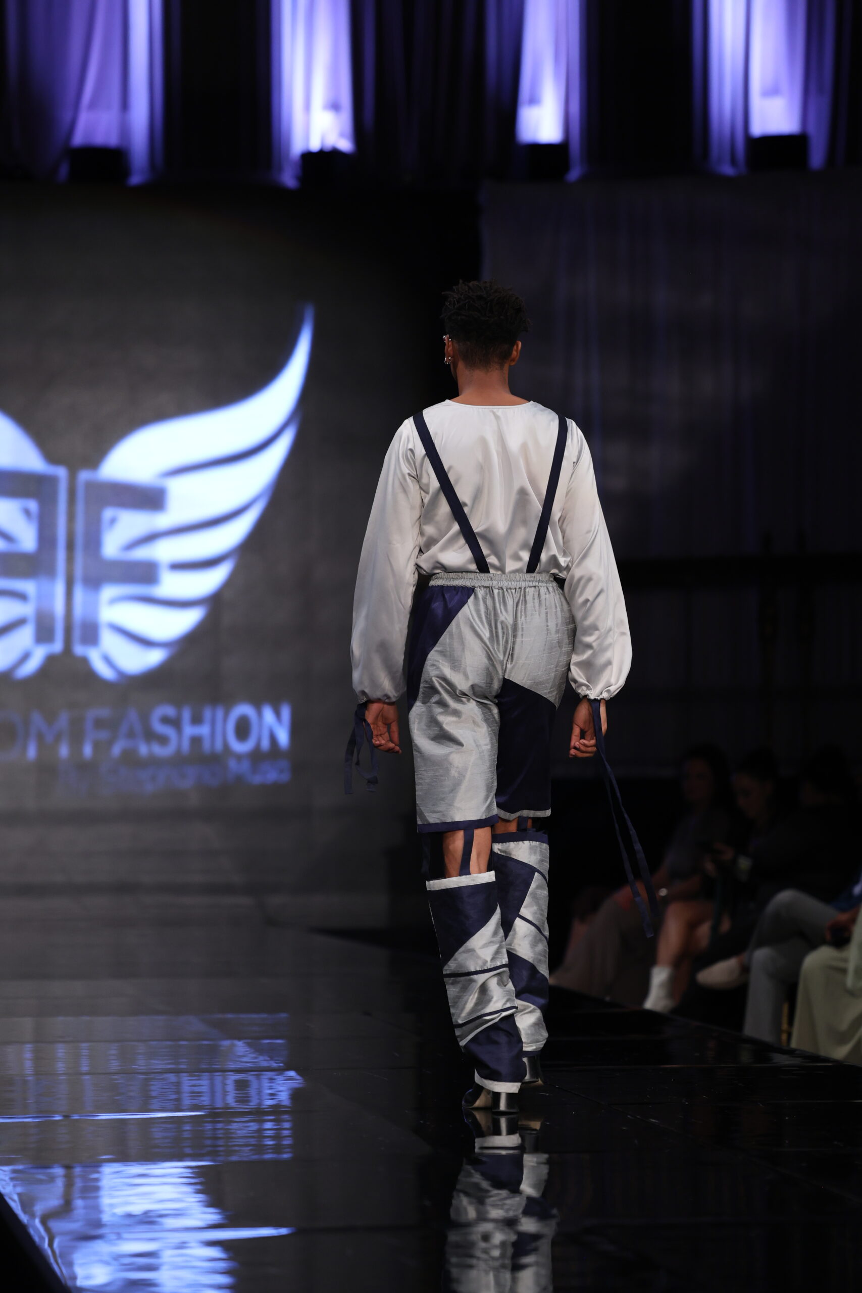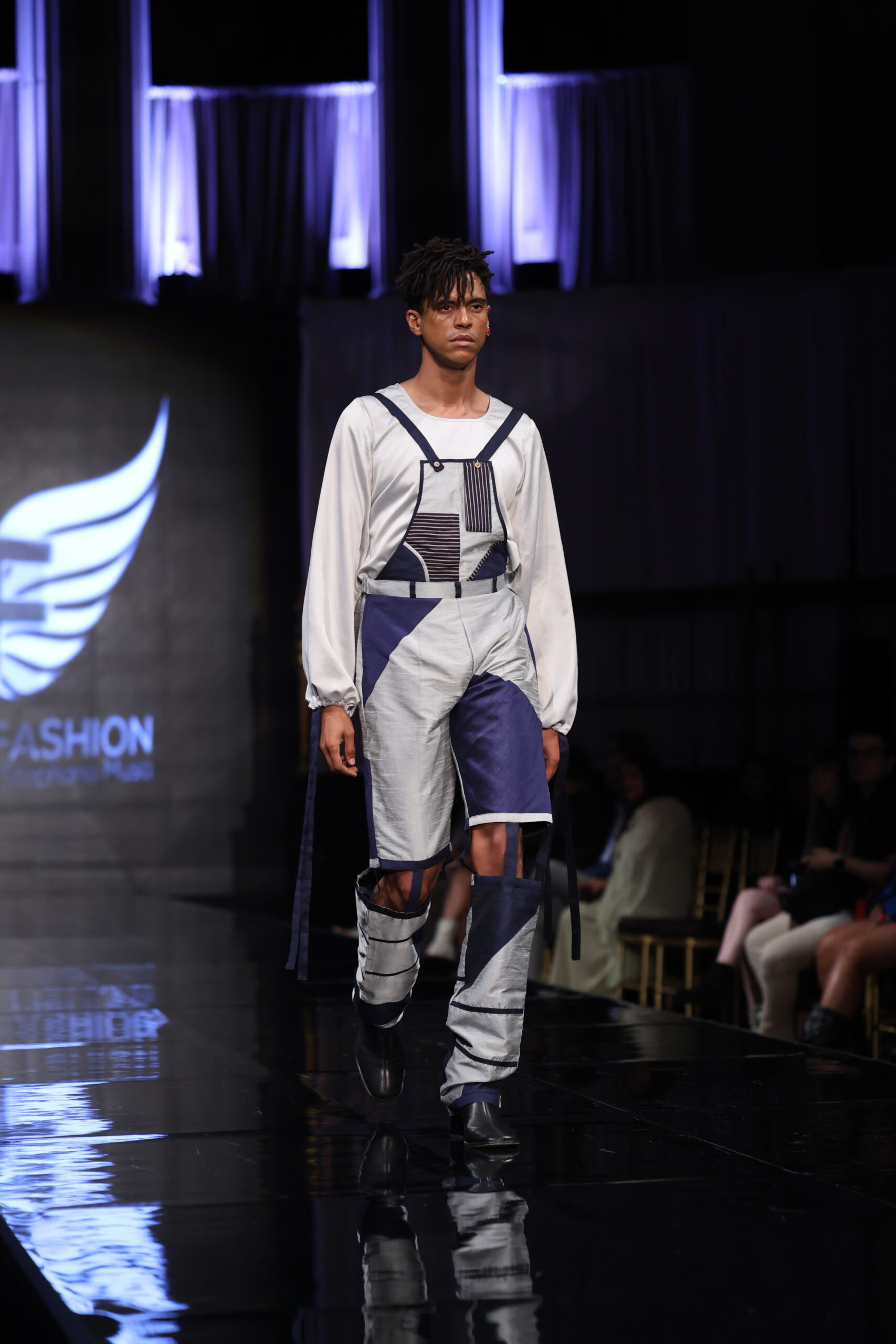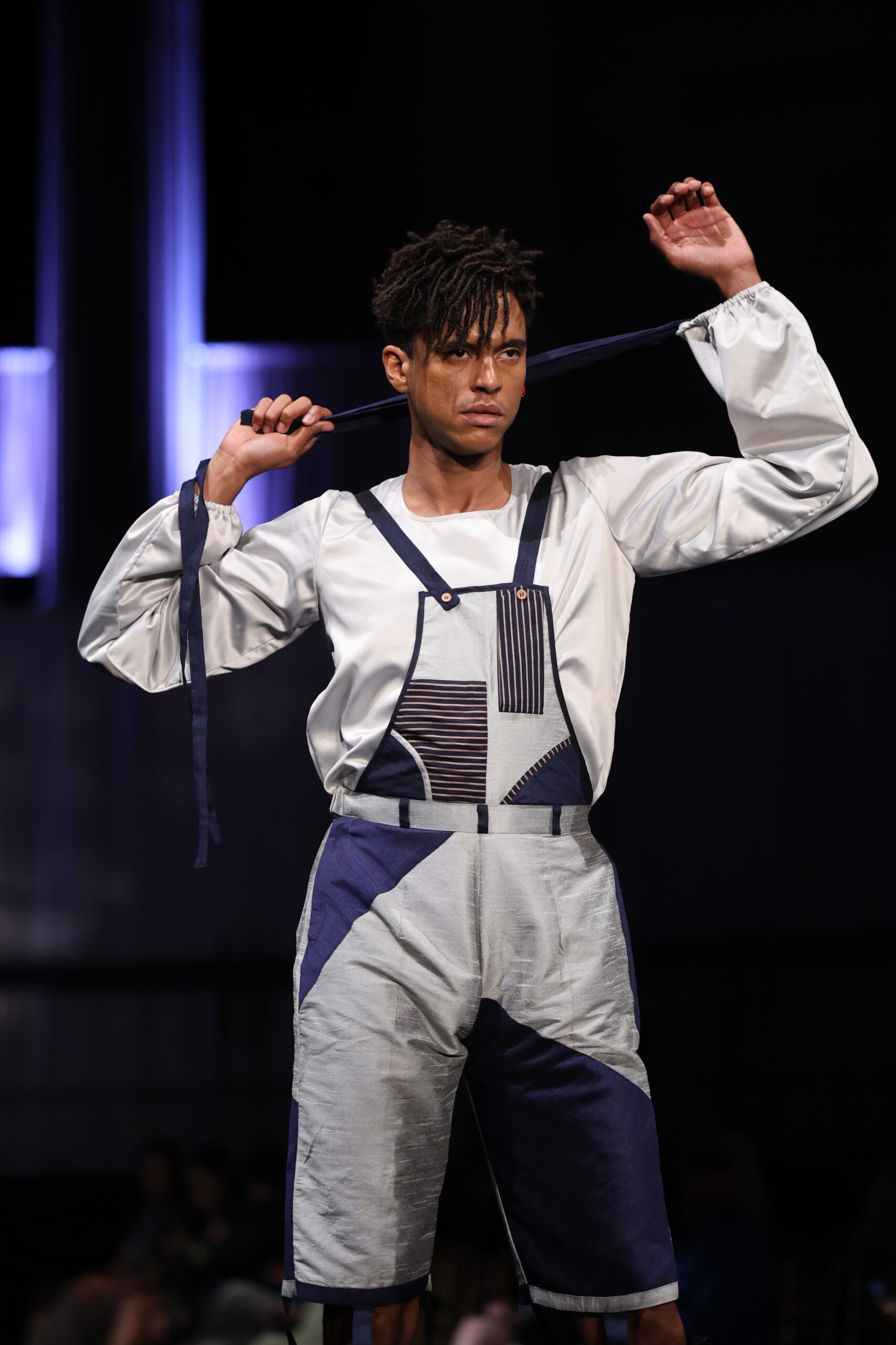 The Veil of Becoming — Constructed Overall reimagines traditional structure through a fragmented, architectural lens. Built from contrasting panels and layered forms, the piece embodies the process of becoming—where identity is not fixed, but continuously shaped and reshaped.